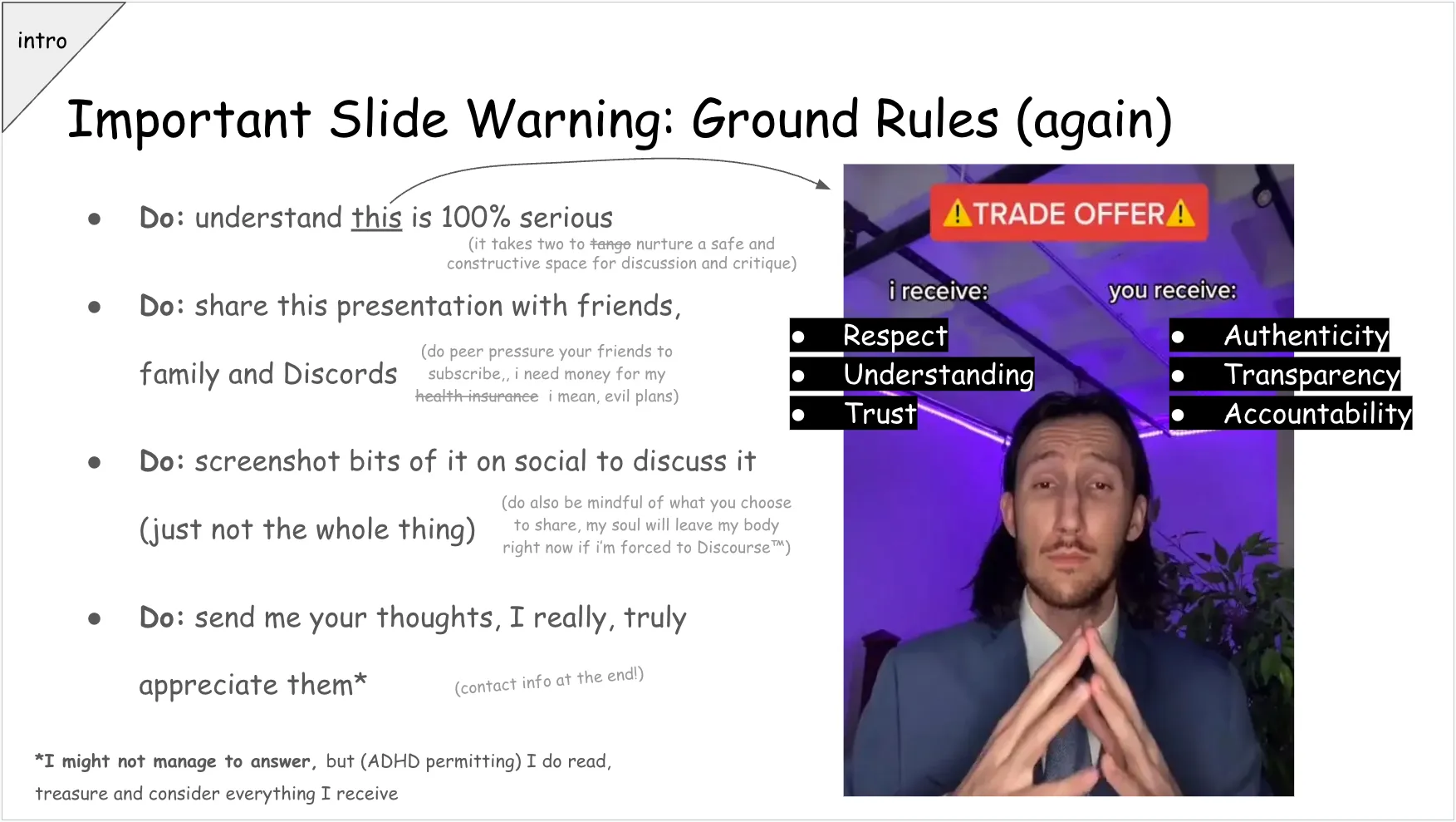 I’m glad you asked! The goal of these extravaganzas is to create a space where people who support my work can not only be kept up to date, but receive this information in a way that’s authentic, transparent, and holds me accountable for the choices I make. While this is important to me, however, it’s also important that people on the other side understand it as a mutual exhange. Indeed, this relationship can only flourish in an environment where people respect who I am, understand the difficult constraints I work under, and trust that, while I will make mistakes along the way, I’m deeply committed to my stated ideals.
